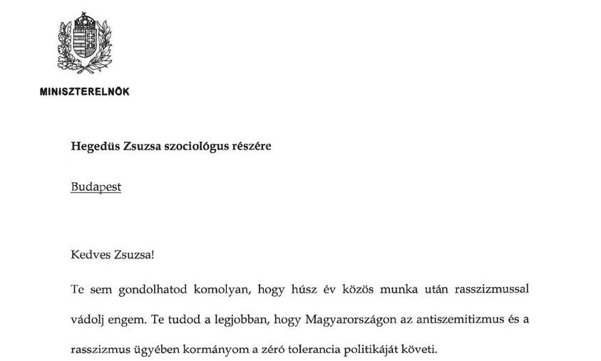 Orbán Viktor miniszterelnök levélben válaszolt Hegedüs Zsuzsa szociológusnak