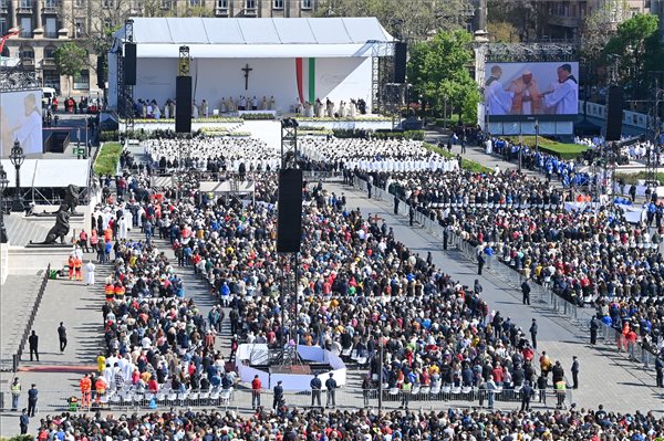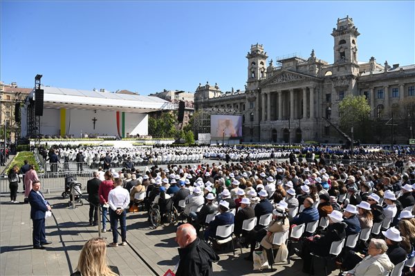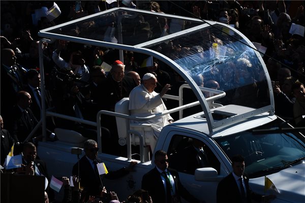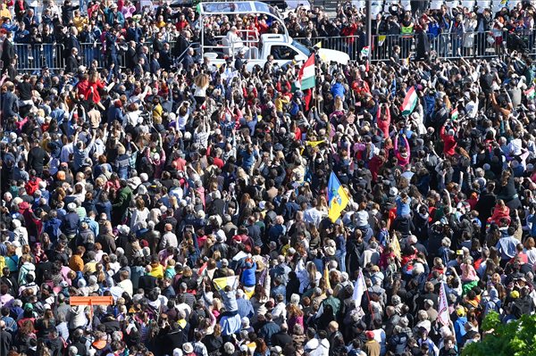 Megtelt a Kossuth Lajos tér Ferenc pápa vasárnap délelőtt tartandó szentmiséje előtt. A katolikus egyházfő nyitott fehér autóban érkezett kilenc óra körül a térre, mögötte Erdő Péter bíboros, esztergom-budapesti érsek volt látható - jelentették a helyszínről az MTI tudósítói.